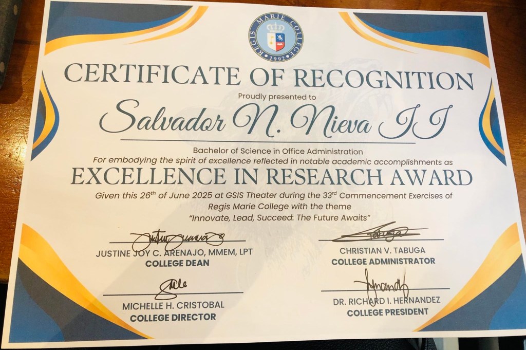 On a humid June afternoon at the GSIS Theater in Pasay City, Salvador Nieva II walked across the stage in his toga, beaming with pride. At 34 years old, the father of two received his Bachelor’s degree in Office Administration from Regis Marie College.
